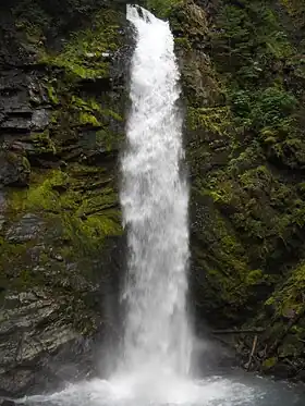 One of the better known falls on the slopes of Mount Baker, the falls are a single plunge of 90 feet (27 m) within a small gorge which the falls mark the beginning of. Several thousand feet downstream from the falls, the creek passes under Wells Creek Road & immediately is joined by Wells Creek's only major tributary, Bar Creek. A large culvert, rather than a bridge crosses the creek along Wells Creek Road.