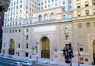 In the late 1920s, numerous high-rises were constructed in Center City Philadelphia.[2] Among the businesses commissioning new high-rises was the Fidelity-Philadelphia Trust Company, the result of the 1926 merger between Fidelity Trust Company and the Philadelphia Trust Company. Before the merger, in 1925, architects Edward P. Simon and Grant M. Simon of the firm Simon and Simon were approached to design a new building. The designs were complete by the end of 1926 and in January 1927 general contractor Irwin & Leighton was engaged to build the Fidelity-Philadelphia Trust Company Building.[3][4] The site of the building along Broad Street was previously the location of the Forrest Theater and the "Yellow Mansion" (also known as the Dundas Lippincott House).[5][6]