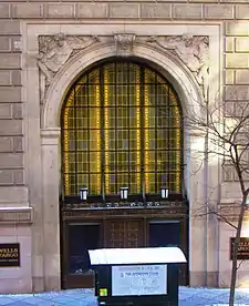 At street level, three arched entranceways line Broad Street. The central arch is slightly larger than the others to indicate the entrance to the main banking hall. Carved into the facade above the center arch is the building's name. Inside the arches and above the doorways are windows designed by d'Ascenzo Studios. Leaded panes of glass of various shades of amber are surrounded by a Renaissance-style border. Below the windows are bronze doors, each with 24 high-relief panels depicting the history of commerce and civilization. Bas-relief figures decorate each of the arches' spandrels. A male figure with a hammer representing industry and a female figure with a beehive representing thrift decorate the center arch. The arch closest to Sansom Street is decorated by two figures with cornucopias to represent abundance. The arch nearer to Walnut Street is decorated by a painter and a sculptor to represent art.[3]