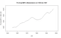 The gross disposable household income in Wales per head was £9,402 in 1997 (87.4% of UK average) reaching its highest level ever in the most recent figure in 2020 of £17,592 (82.1% of UK average).[23]