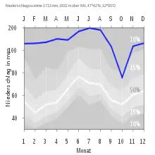 The annual precipitation is 1,714 mm (67.5 in), which is extremely high, lying in the upper twentieth of values in Germany. 99% of German Met Office weather stations register lower values. The driest month is October, the wettest is July, which experiences 2.6 times as much precipitation as October. Annual variations are extremely large. Only 3% of weather stations register higher annual variations.