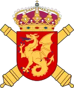 The coat of the arms of the Wendes Artillery Regiment (A 3) 1977–2000. Blazon: "Gules, the regimental badge, a wyvern or, armed and langued azure. The shield surmounted two gunbarrels of older pattern in saltire or. The gunbarrels may be sable".[5]