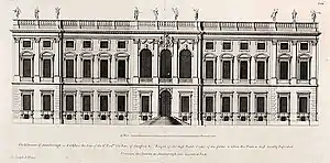 The first earl died in 1739 and his son succeeded him. William Wentworth, 2nd Earl of Strafford (1722-1791) rates an entry in Colvin's Biographical Dictionary of British Architects as the designer of the fine neo-Palladian range, built in 1759–64 (illustration, upper right). He married a daughter of the Duke of Argyll[21] and spent a year on the Grand Tour to improve his taste; he eschewed political life. At Wentworth Castle he had John Platt (1728–1810)[22] on the site as master mason and Charles Ross ( –1770/75) to draft the final drawings and act as "superintendent"; Ross was a carpenter and joiner of London who had worked under the Palladian architect and practised architectural amanuensis, Matthew Brettingham, at Strafford's London house, 5, St James's Square, in 1748–49. Ross's proven competency in London in London doubtless recommended him to the Earl for the building campaign in Yorkshire.[23] At Wentworth Castle it was generally understood, as Lord Verulam remarked in 1768, "'Lord Strafford himself is his own architect and contriver in everything."[24] Even in the London house, Walpole tells us, "he chose all the ornaments himself".