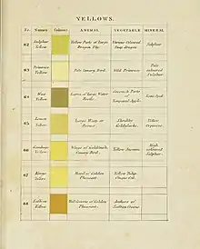 Werner's Nomenclature of Colours is a book of named colour samples compiled by Abraham Gottlob Werner, and subsequently amended by Patrick Syme.[1] The book, first published in 1814, was used by Charles Darwin in his scientific observations.[2][3] Werner's Nomenclature can be viewed as a predecessor of modern named colour systems such as Pantone.[2] The colours are illustrated and described, and examples shown of their use in ornithological plates in The Anatomy of Colour by Patrick Baty.