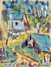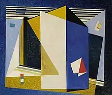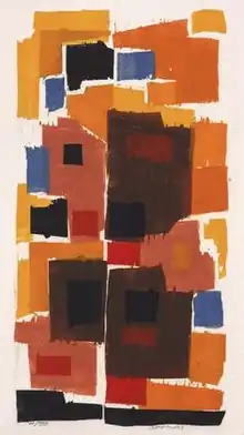 In 1937 he participated in the first group exhibitions of the two organizations he had helped to found: a showing of approximately 250 members of the American Artists Congress in the International Building, Rockefeller Center, and another of the 39 members of American Abstract Artists in the Squibb Galleries.[19][20] Of the former, a critic singled out a painting of his as a "well deliberated" contribution to among those that were non-objective among the polemical and Social-Realist figurative works in the show.[19] In 1937 Drewes also exhibited at the East River Gallery in an innovative program that gave potential buyers the option of renting a work while deciding whether or not to buy it.[21] During the same eventful year a prominent architect, Wallace Harrison, helped Drewes obtain a position at the School of Architecture of Columbia University. He remained there for the next three years teaching painting, drawing, and printmaking while also making prints for the Graphic Arts Division of the WPA Federal Art Project in New York.[2][4]