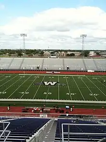 In May 2009, renovation of the stadium began to increase seating capacity as well as adding various new features to the Stadium costing an estimate of $7 Million .[12] The home side seating serves 7,100 fans with approximately 1,000 seats with purple VIP backrest seating accommodations. The visitor side bleacher seating serves approximately 6,300 fans.[13] The lower level of the press box incorporates home and visitor independent ticket booth sales. The exterior façade has distinct arches over the first floor, thus also serving as protection to the fans from the elements.