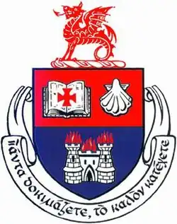 In 1969, the college obtained from the Chief Herald an official grant of arms, which replaced that previously used. The upper part of the shield has a red ground, and bears the Bible, surmounted by a Maltese cross, an old Wesley College symbol. To the right is an escallop shell from the arms of John Wesley's family. The lower part of the shield has a blue ground and on it a flaming castle from the Dublin City arms. The scroll below the shield contains the college motto in Greek, "Prove all things; hold fast that which is good." (I Thessalonians 5.21)[6]
