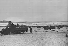 On April 25, 1945, Col. Yale commanded CCB through the Thuringian Forest, Germany, toward a Nazi concentration camp. Yale shouted orders in his radio, and tanks and mobile guns moved toward the ridge, and after raising his hand, he gave the command to fire.[7] The French, English, Russians, Polish, Dutchmen, Belgians, Norwegians and American prisoners in the camp started singing "Georgie Patton, come and get us! Georgie Patton, set us free!".[7] After hearing the voices, Col. Yale shouted "what are we waiting for?" and sent hundred of vehicles, including tanks, jeeps and trucks rescuing the prisoners from the camps.[7] They liberated from the SS about 3,000 prisoners from Bamberg, and on their way to Flossenbürg and Buchenwald camps, they met another 16,000.[8]