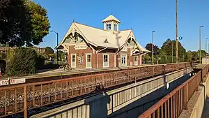 West Chicago is a station on Metra's Union Pacific West Line, located in West Chicago, Illinois. The station is 29.7 miles (47.8 km) away from Ogilvie Transportation Center, the eastern terminus of the West Line. In Metra's zone-based fare system, West Chicago is in zone F. As of 2018, West Chicago is the 88th busiest of the 236 non-downtown stations in the Metra system, with an average of 586 weekday boardings.[1] Unless otherwise announced, inbound trains use the north (side) platform and outbound trains use the south (island) platform.