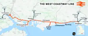 The West Coastway line runs almost alongside or within a few miles of the south coast of Sussex and Hampshire, between Brighton and Southampton.[1][2][3]