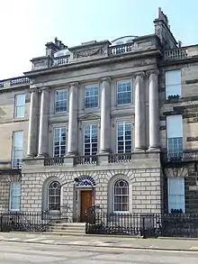 Under the Brown plan Melville Street would form the centrepiece of the new Georgian West End Village, extending directly from the western facing side of West Register House and Randolph Place. The street would be accessed to the south at Shandwick Place, from Coates Crescent by Walker Street, which would itself be intersected by William Street to create a Georgian grid layout, with both roads named after William Walker. Construction began in 1813 on Coates Crescent. Brown also developed Atholl Crescent which faces Coates Crescent.[20] Melville Street was largely completed by the 1830s although the corner plots would remain unfinished until the 1860s.[18][21] At the centre of Melville Street is a bronze statue of Robert Dundas, 2nd Viscount Melville standing on two large stone steps.[22][23]