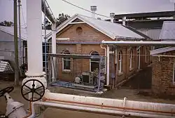 Also at about this time, a standby gas-engine powered alternator/generator was installed, along with a main switchboard of significant proportions. These are housed in a compartment attached to what was described in 1994 as the Engine Drivers Room. In 1948, meters and valves occupied this space, the building probably being known as the Meter House. Both the meters and the compressors were housed in gabled brick buildings with arched sash windows. The east fronts of these two buildings are aligned and form an elegant pair when viewed from the east.[1]