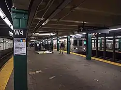 The walls of the station contain green-tile bands with green borders; since West 4th Street is an express station, it has a wider tile band than local stations.[64] The tile colors were designed to facilitate navigation for travelers going away from Lower Manhattan; on the Sixth and Eighth Avenue lines, the tiles change color at the next express station to the north. As such, the green tiles used at the West Fourth Street station were also used on local stations to the north on Sixth Avenue, 14th Street and 23rd Street. The next express stations on either line, 14th Street on the Eighth Avenue Line and 34th Street–Herald Square on Sixth Avenue, used a different tile color.[65][66] When the station was under construction, New York University (NYU) officials had requested that the station contain purple tile bands because that was NYU's official color. However, this was not done because it would not have fit with the color-coded tile system used on the rest of the IND.[15] Small tile captions reading "WEST 4" run below the trim lines at regular intervals. Hunter green I-beam columns run along all the platforms, alternating ones having the standard black station name plate; The signs read "West 4 Street", replacing the older signs which simply read "W4".