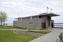 There are two facilities on the grounds of the West Side Rowing Club. The Doc Schabb Boathouse features an indoor rowing tank, ergometers and five bays of boat storage.[12] The Fontana Boathouse was built in 2007 and is the newest facility at the West Side complex, home to the Canisius Golden Griffins women's crew since 2011.[13] The design of the boathouse was adapted from plans by architect Frank Lloyd Wright for the Wisconsin Badgers Crew. When the University of Wisconsin–Madison suspended its football program in 1906 over safety concerns, plans for the boathouse were abandoned.[14] Wright's plans were later reintroduced at West Side and the boathouse was constructed, opening in 2007.[15]