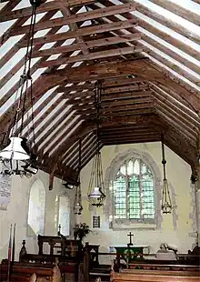 Adjacent to Manor Farm is St Nicholas Church, small church dated to the late 12th century, which forms one of eleven churches in the Northanger benefice.[1] It fell into ruin and lost its roof before it was restored in the late Victorian period in 1888.[23] It is a single-cell building, with 2 small lancets on the north side, and contains windows dated to the 15th and 16th century.[23] The two doorways date to the 13th century, and the timber-framed porch on the south side to the 15th century.[23] The interior is described as "plain, with a piscina in the east wall and 2 in the nave, an octagonal font, and 3 wall monuments of the late 18th century."[23] The church became a listed building on 31 July 1963.[23]