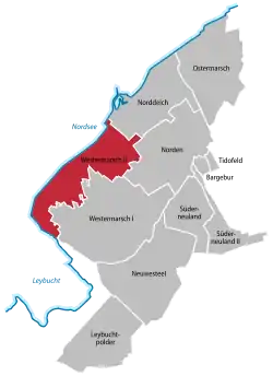 Westermarsch II was an independent municipality until the 1972 territorial reform in Lower Saxony and, as such, a member of the collective municipality (Samtgemeinde) of Leybucht in Lower Saxony. Today Westermarsch II is a village in the East Frisian borough of Norden with around 500 inhabitants (as at 12/2016).[1] The village parish covers an area of 11.69 km².[2] Curiously the main settlement of Westermarsch II is associated in public perception with the village of Norddeich, with which it has grown together. The boundary between the two runs down the middle of the road, Dörper Weg.