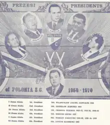 The highlight era in the club's history, were the early 1960s. In the season of 1960 and 1961 Polonia won back to back State League Championship, and becoming 1961 Dockerty Cup Winners beating George Cross 4:2 in the Final on 7 October, at Olympic Park with goals from Zygmund Gross, Zdzislaw Maruszkiewicz and a brace from Mieczyslaw Jurecki. This most successful side in the club's history also won the prestige "World Cup" tournament. Some of the most influential players of that time were; Mieczyslaw Jurecki, Wieslaw Janczyk, Wieslaw Gamaj, Zdzislaw Maruszkiewicz, Jerzy Dudon, Charlie Morks, Marian Gasior, Remo Guardiani, Ryszard Szczepanski, Roch Dronia, Kazimierz Szygalski, Zygmunt Gross, Henryk Gronowski, Ference Voros. President of Polonia SC at that time was Dr. Charles Walker. Our club also had representatives at international level. Players that had the honor to represent the Australian national team were George Pittoni, Lolly Vella and Robert Wemyss. Mieczyslaw Jurecki and Kazimierz Kowalec had the opportunity to play in the Australian "B" team.[3] There was a number of players that were Poland's national team representatives ; Wieslaw Janczyk, Edward Jankowski, Zygmunt Gadecki, Norbert Gajda, Henryk and Robert Gronowski, Mieczyslaw Jurecki, Edmund Zientara.