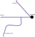 ![]() Map of Rail Lines in Melbourne's West that go through Sunshine. Blue means the line will be or is electrified, purple means it is a regional line. | |