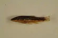 Western blacknose dace (Rhinichthys obtusus) is a common species of ray-finned fish belonging to the family Cyprinidae (minnow or carp)[3] and the genus Rhinichthys. Western blacknose dace have tan to dark brown backs, lighter sides, and cream colored undersides.[4] Dark blotches are sporadically scattered across their sides and backs.[4] A distinctive dark colored mid-lateral stripe from the tip of the snout to the caudal peduncle is present.[4] The snout is relatively long and they have a slightly sub-terminal mouth.[5] The stripe is dark brown in females and is a rusty pink color in males during spawning season.[6] The lateral stripe is more pronounced and the caudal spot is present in juveniles.[7] Similar to other species of dace the western blacknose dace give the illusion of having no scales but in actuality the scales are so small they are hard to see.[4] Western blacknose dace are typically 2-3 inches long but can grow to as long as 4 inches.[4] They have a forked tail, single dorsal fin with 8 rays and no spines, a pelvic fin on the abdominal, no adipose fin, and an anal fin with 7 rays and no spines.[7]