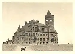 Architect E.B. Gregory designed and laid the cornerstone for the university's main building, which was to be constructed of gray stone from the Coal Creek area. After delays in construction caused by lack of funds, Mayham hired New York architect Stanford White to finish the design and oversee construction. White changed a main design element, the stone, to a red sandstone from the Red Rocks/Manitou area. White's design was completed by 1893: 160 ft frontage, 80 ft depth, three stories tall, with a distinctive 175 ft tall tower. The building's architectural style is an excellent example of Richardsonian Romanesque.