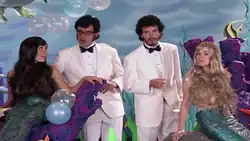 That night at the bar, Bret and Jemaine are invited to sit with the members of the North Jersey University Women's Water Polo team. After finding out they are in a band, the women ask for their autographs and suggest partying in the boys' room. Bret and Jemaine head upstairs first and, on the way up to their room, sing "Mermaid".