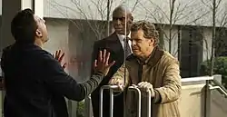 ![]() Walter and Broyles block an infected man from escaping the building | |
