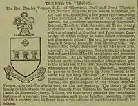 The Harlands returned to live at Wherstead Park after this. Robert died there in 1848 and Arethusa in 1860. The Park was inherited by a distant relative the Rev Charles Jenkin[14] who changed his name to Vernon to comply with the conditions of the inheritance. He died only three years later in 1863 without male issue and the house was inherited by Arethusa’s great nephew Charles Edmund Dashwood.[15] This complex line of succession is explained in the extract shown below.