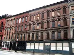 The 100 West Main Street Whiskey Row Historic District refers in particular to a block-long stretch from 101 to 133 W. Main Street, which was listed on the National Register of Historic Places in 2010.[1] It is a collection of eleven contributing buildings in Renaissance Revival, Beaux Arts, and Chicago School styles with cast-iron storefronts that were built between 1852 and 1905.[7]