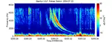 VLF spectrogram of an electromagnetic whistler wave, as received by the Stanford University VLF group's wave receiver at Palmer Station, Antarctica.