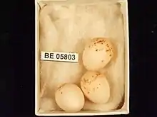 White-eared honeyeaters breed and nest from July to March. The nest is built among tangled twigs and leaves, low in a small shrub, bracken or coarse grass from 0.5 to 5 m high.[3] The cup-shaped nest is constructed out of dry grass, fine stems, thin strips of bark and held together with cobwebs. The nest is lined with soft vegetation, down, feathers, hair, or fur.[3] White-eared honeyeaters will pluck fur and hairs from livestock, humans, and native wildlife, such as kangaroos and wallabies.[8] White-eared honeyeaters form territories, which can expand during winter when some key resources are in lower densities.[9][12] A clutch is typically 2 or 3 eggs. The eggs are oval shaped, white with brown speckles at the large end and measure 21 x 15mm.[3] A clutch is typically 2 or 3 eggs. The parents are obligate cooperative breeders of their chicks.[3][19]