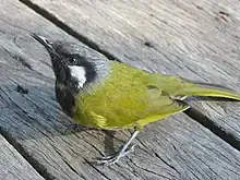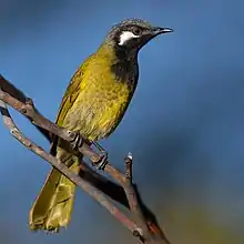The white-eared honeyeater (Nesoptilotis leucotis) is a medium-sized honeyeater found in Australia. It is a member of the family Meliphagidae (honeyeaters and Australian chats) which has 190 recognised species with about half of them found in Australia.[2] This makes them members of the most diverse family of birds in Australia. White-eared honeyeaters are easily identifiable by their olive-green body, black head and white ear-patch.[3]