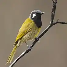 White-eared honeyeaters feed on nectar and insects.[21][22] They are often considered nectarivores, but feed on insects just as much.[23] They feed on nectar during the spring and summer (August - December), but switch to insects for the rest of the year.[9] White-eared honeyeaters actively probe for insects on tree trunks and branches.[9][10][23][24] They prefer trees with soft, peeling and flaking bark, where insects may be present.[10] They mostly collect termites and spiders, but will also feed on the lerp and honeydew produced by insects.[9] While foraging, the white-eared honeyeater searches intensively for its insect prey, averaging one insect every 5 seconds.[24] This high-volume approach to foraging indicates that the insects being consumed are of low nutritional value. Obligate nectarivores compete strongly with white-eared honeyeaters for the best nectar resources and obligate insectivores compete with white-eared honeyeaters for the best insect resources. This results in the white-eared honeyeater needing to use alternative sources of food, such as insects which are smaller or better at hiding.[10] The yellow-faced honeyeater (Caligavis chrysops) has a similar feeding strategy to the white-eared honeyeater. Aggressive behaviour from the yellow-faced honeyeater directed at the white-eared honeyeater has been observed.[25]