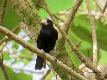 EBird describes the bird as "A small, uncommon bird of lowland and foothill forest canopy and edge. Entirely dark with an obvious white mark from the forehead down between the bill and eye. Males are entirely black and females have dark brown underparts. Varies regionally, with Mindanao birds having an additional white mark in the wing. Unmistakable. Voice includes a downslurred series of three fairly high-pitched downslurred notes, "piu-piu piu". Also gives a rapid staccato trill."[2] It is often seen in exposed branches in the canopy.