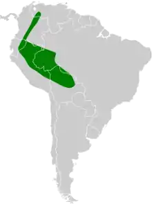 It is found from eastern Colombia to eastern Peru and western Brazil and northern Bolivia. Its natural habitat is subtropical or tropical moist lowland forests.