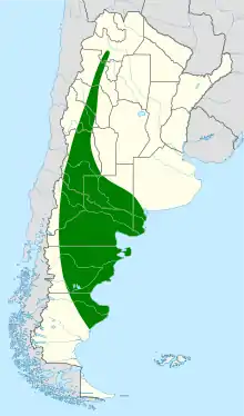 Subspecies P. g. ochroleuca of the white-throated cacholote is the more northerly of the two; it is found in northwestern Argentina. The nominate subspecies is found in central Argentina.[2] The geographic dividing line or overlap area between them is unclear.[5] The species inhabits generally barren landscapes such as arid scrublands in lowlands and montane valleys; in the north it also occurs in woodlands dominated by Prosopis. In elevation it ranges from sea level to 2,900 m (9,500 ft).[5]
