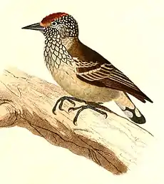 The white-wedged piculet has two subspecies, the nominate P. a. albosquamatus and P. a. guttifer (Sundevall, 1866).[2] P. a. guttifer has at times been treated as a separate species but intergrades and hybridizes with the nominate. The white-wedged piculet hybridizes with the white-barred piculet (P. cirratus), the ocellated piculet (P. dorbignyanus), and the ochre-collared piculet (P. temminckii).[3][4]