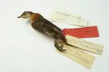 The white-winged flufftail (Sarothrura ayresi) is a very rare African bird in the family Sarothruridae. The estimated global population size of white-winged flufftails is less than 250 adults.[2] These birds reside in Ethiopia and South Africa but it is unknown whether these populations are one large or two different populations.