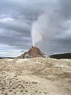 White Dome is a conspicuous cone-type geyser located on the western side of Firehole Lake Drive. It is easily seen by people waiting for eruptions of nearby Great Fountain Geyser. Its 12-foot-high geyserite cone is one of the largest in the park. Eruptions are unpredictable, but generally occur with intervals (= eruption start to eruption start) ranging from 15 minutes to 3 hours.[2] The shortest reported intervals have been 8 to 11 minutes. Intervals between 20 and 35 minutes are most common.[3] Eruptions last about 2 minutes and reach heights of about 30 feet (9.1 m), the maximum height being attained early in the eruption. As usual for cone-type geysers, the play is continuous for most of the eruption's duration. Eruptions usually start without warning, although minor spitting may occur a little or immediately beforehand. Eruptions conclude with steam mixed with liquid spray. Between eruptions, minor spitting lasting 1 to 2 seconds may occur. Rarely, a minor eruption may occur involving about 10 to 15 seconds of hesitating, moderately low spouting and splashing.