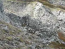 The Austro-Hungarian Kaiserschützen military barracks were built on the Gran Poz summit (approximately 11,000 ft, approximately 3.35km, above sea level) of Mount Marmolada. The wooden barracks were built in August of the summer of 1916, to house the men of the 1st Battalion of the Imperial Rifle Regiment Nr.III (1.Btl. KschRgt.III). The location of the barracks was planned to be well situated to protect it from Italian attack and provide a defense atop the contested Mount Marmolada. The barracks was placed along rock cliffs to protect it from direct enemy fire and the location was out of high-angle mortar range.[3]