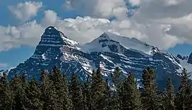 ![]() White Pyramid (right) and Mount Chephren (left) seen from north along the Icefields Parkway | |