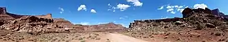 The White Rim Road traverses the White Rim Sandstone formation between the base of the Island in the Sky mesa and the Colorado and Green Rivers within Canyonlands National Park.
