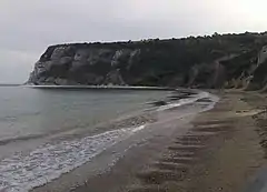 Whitecliff Bay is a sandy bay near Foreland which is the easternmost point of the Isle of Wight, England, about two miles south-west of Bembridge and just to the north of Culver Down. The bay has a shoreline of around three-quarters of a mile (1.2 km) and has a popular sandy shingle beach which is over half a mile long.[1] It is a tourist site with three holiday parks in the vicinity of the bay; it has two cafes though minimal facilities. Access is limited and only possible down two steeply sloping concrete tracks.