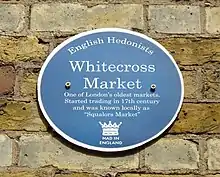 Whitecross Street Market, having been in existence for over 150 years, is one of London's oldest markets. The market was formerly one of London's great Sunday markets, and dates to the 17th century; although today, trading is largely limited to lunch times.[5] During the mid-19th century, the street vendors and costermongers operating out of an informal street market in Whitecross Street came to public attention following the publication of a series of articles written by journalist, James Greenwood, and published in the Pall Mall Gazette. Greenwood's articles presented a brutal picture of the lives of London's poorest classes and caused a public sensation.[6] By the end of the 19th century, the area had become a by-word for poverty and alcohol, and it became known as Squalors' Market.[7]