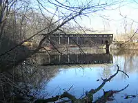 White's Bridge was the third bridge across the Flat River at or near this location south of Smyrna, which was a crossing point or ford, even before the bridges were built.[4] The "Whites Bridge" and "Whites Crossing" names are taken from the White family, prominent pioneers of the day. The original bridge, built in 1840 by Levi T. White and his sons, was a corduroy bridge made of logs. A second bridge, built about 1856, reportedly at a cost of $250, was destroyed by an ice jam during the spring breakup of 1869. The residents of Smyrna sought a replacement with plans to pay for it with a deferred payment.[2]