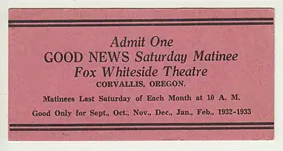 - 1 2 "Whiteside Opened: Refinished Theatre Starts New Career with Fine Program Last Night," Corvallis Gazette-Times, Jan. 3, 1928, pg. 7.