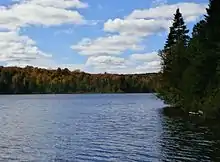Its maximum approximate depth is 2 metres (6 ft 7 in), its width is 750 meters (2,460 ft) and its length is 1.5 kilometres (0.93 mi).[1] Even if the lake is located only a few kilometers from Lake Mégantic and Lake Mckenzie, its outlet flows into the neighboring watershed as far as Grand lac Saint-François, source of the Saint-François River.[2]