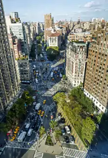 In spring 2017, as part of a capital reconstruction of Worth Square, Broadway between 24th and 25th Streets was converted to a shared street, where through vehicles are banned and delivery vehicles are restricted to 5 miles per hour (8.0 km/h). Delivery vehicles go northbound from Fifth Avenue to 25th Street for that one block, reversing the direction of traffic and preventing vehicles from going south on Broadway south of 25th Street. The capital project expands on a 2008 initiative where part of the intersection of Broadway and Fifth Avenue was repurposed into a public plaza, simplifying that intersection.[29] As part of the 2017 project, Worth Square was expanded, converting the adjoining block of Broadway into a "shared street".[30]