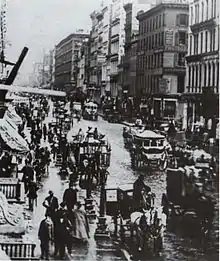 In 1880, a stretch of Broadway between Union Square and Madison Square was illuminated by Brush arc lamps, making it among the first electrically lighted streets in the United States.[69] By the 1890s, the portion from 23rd Street to 34th Street was so brightly illuminated by electrical advertising signs, that people began calling it "The Great White Way".[70] When the theater district moved uptown, the name was transferred to the Times Square area.