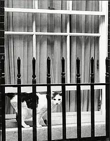 Wilberforce was an eight-week-old white tabby kitten when adopted from the Hounslow branch of the Royal Society for the Prevention of Cruelty to Animals in 1973.[1] He was appointed the Downing Street office manager's cat to deal with a mouse infestation, and given a living allowance. He was named Wilberforce in honour of the English abolitionist William Wilberforce.[1] Downing Street staff would reply to mail sent to him "wanting to know how he was, [wishing] him luck".[2] Despite his role as chief mouser to the Cabinet Office, he rarely visited the Cabinet room, instead preferring the Scottish Office, 11 Downing Street and the Foreign Office.[1]