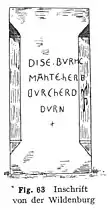 Wildenberg Castle is possibly the castle that is called Montsalvaesch in Wolfram von Eschenbach's Parzival, and depending on its linguistic origin is interpreted as Heilsberg ("Salvation Hill" or "Holy Hill") or wilder Berg ("Wild Hill") (c.f. section 230, verse 13). In the fifth book (Die Gralsburg) the Wildenberg is specifically mentioned: "Who saw such a great fire/Here by us in Wildenberg?" It is possible therefore that Wolfram von Eschenbach wrote part of the novel here.[4] However, other castles may also have been suggested as the subject. Wolfram von Eschenbach may have written his description of the holy hill just based on contemporary paradise literature.[5]